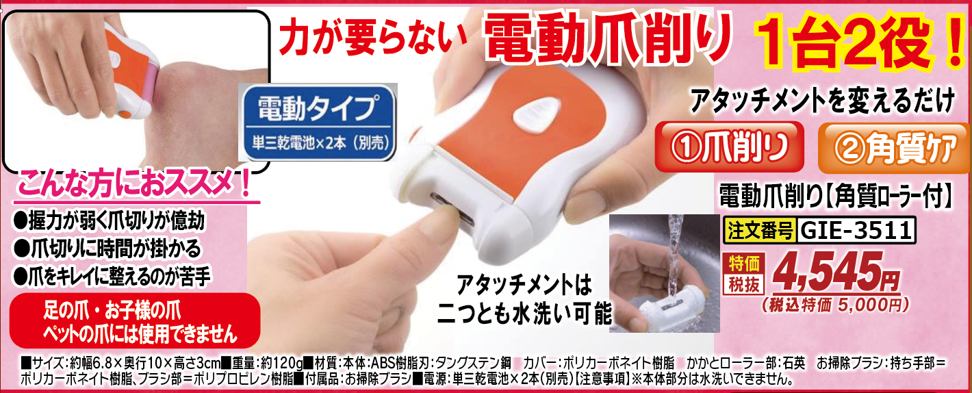 注意事項 | ※本体部分は水洗いできません。 ※足の爪、ペットの爪には使えません。 『在庫:予約注文受付中』と表示の際は、一時入荷待ちになっている場合がございます。発送までにお時間頂く場合もございます。ご注文完了後、 “注文履歴”よりお届け予定日をご確認ください。 |