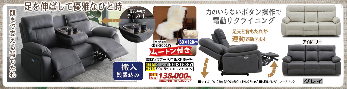 GIE-2330GY 電動ソファ シェル 3P3シーター グレイ