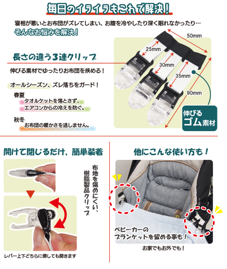 ◆長さの違う3連クリップで、敷布団・毛布・掛け布団それぞれを挟み、ズレ落ちをガードします。