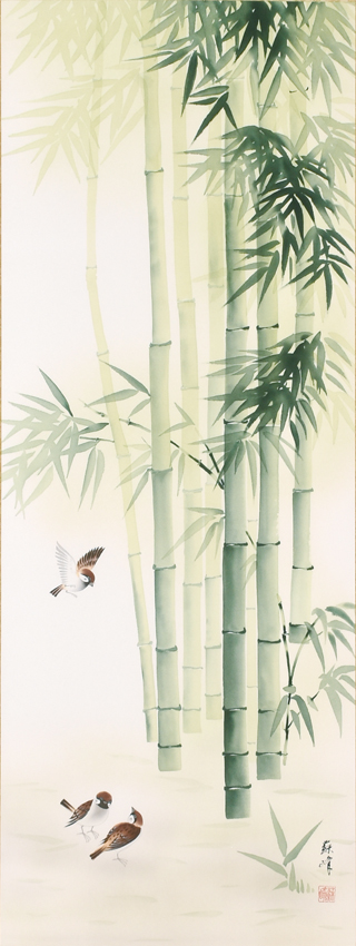 竹はまっすぐに伸びるという成長を表現し、雀は「子孫繁栄」と「五穀豊穣」災難を食べつくすといわれ「家内安全」の願いが込められています。(年中掛)